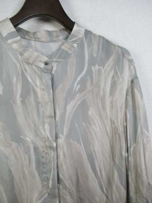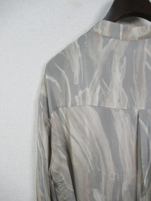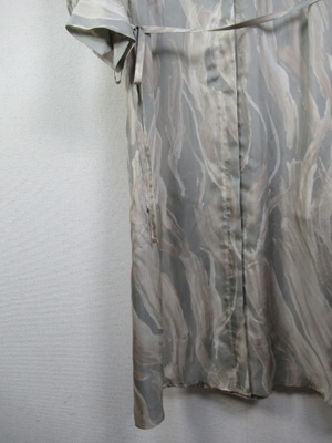 襟なし とろみのある生地 シャツワンピースのようなデザイン 前は下まで開く 比翼ボタン モアレ調の柄 ドロップショルダーでカフス 袖丈やや短め 共の生地でウエスト細いベルト 前を開けて羽織に羽織として着こなしもできる 手洗い可能
