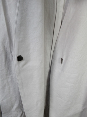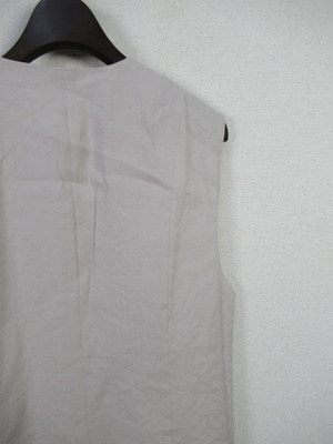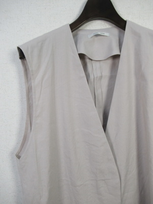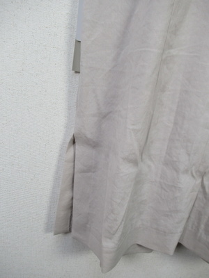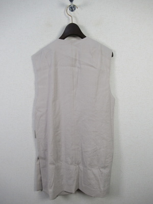 着流し麻素材のジレ 丈感は太ももの中央くらい セミロングジレ 両脇裾に20cmほどのスリット その上に脇ポケットあり 裏地なし 打ち合わせの中心にかぎホック一つあり