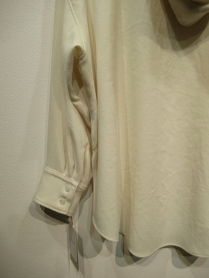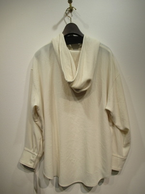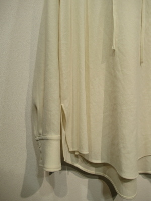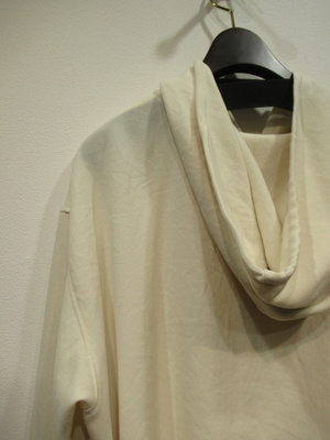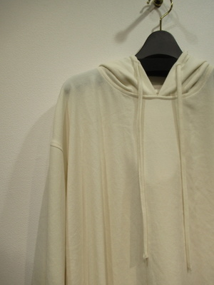 フード襟のプルオーバーカットソー、身頃広め、ドロップショルダー、袖口カフスあり、フードの襟ぐりに紐あり、裾ラウンド、脇スリットあり、手洗い可能