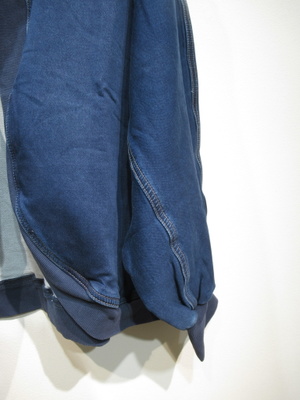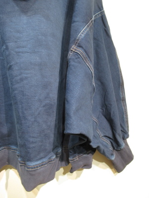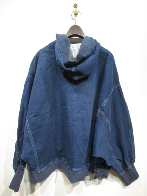 デニム地の着流しパーカー、ビッグシルエット、身頃から直接袖あり、前立てから裾にかけてと袖口がリブ、ポケットあり、手洗い可能