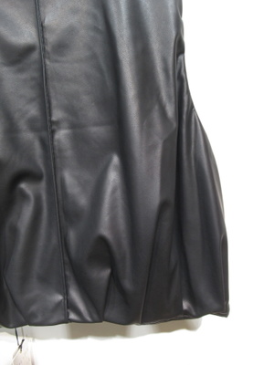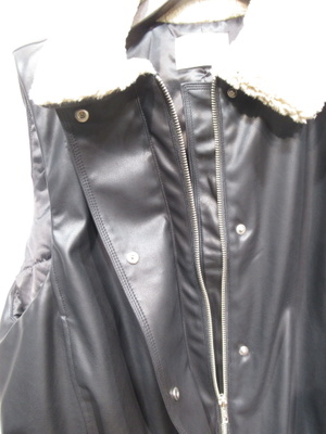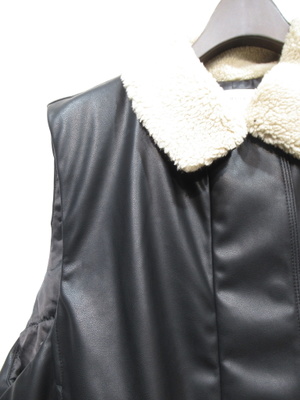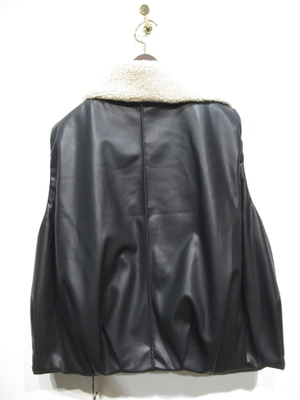 合皮生地 裏地ポリエステルで中綿のようなうな厚みのある感じ 裾はタックが何箇所かに入って丸み感をだしてますフロントファスナーと4つボタン有り フェイクボアの襟 アームは広いのでドロップショルダーのインナーを着てももたつかない