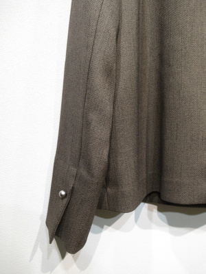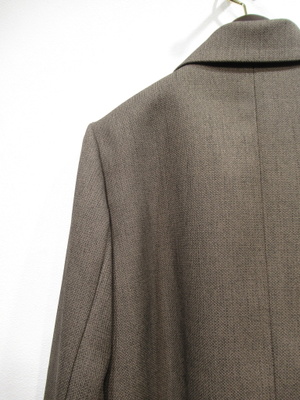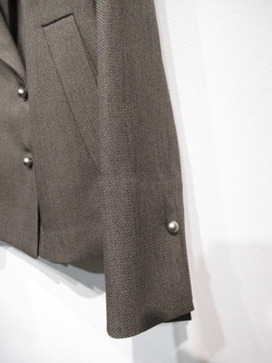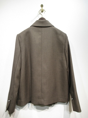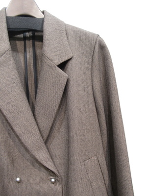 テーラードのダブルジャケット、裏地なし、ボタンは丸いシルバー、袖口も飾りボタンが1つでスリット入り(折り返しできます)、手洗い可能