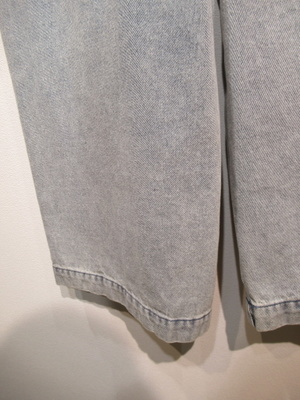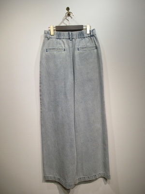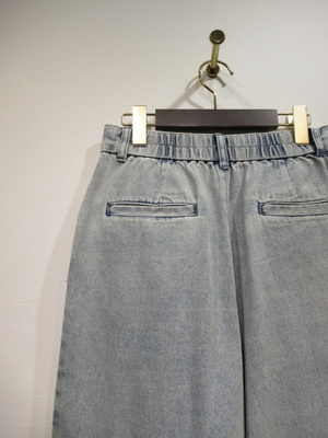 ストレッチなしのデニムです フロントのポケット下から2タック入ったややワイドのデニム 前ファスナーあり 後ろウエストギャザーゴム  手洗い可能  デザイン同じのコットンパンツあり ID:118392