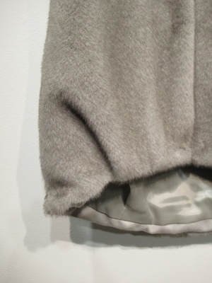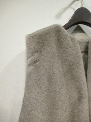 エコファーのベスト フロントカギホック2箇所 裏地付き 裾はタックが入ってコクーンデザイン 前上がりの裾 脇ポケット有り 手洗い可能