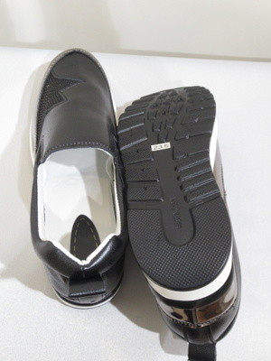 インヒール スリッポン つま先の方に黒のラインストーンで模様あり ややコンパクト 通常サイズよりワンサイズ小さめとお考えください(個人差はございます)特に靴下などお穿きになるとまた違ってまいります。