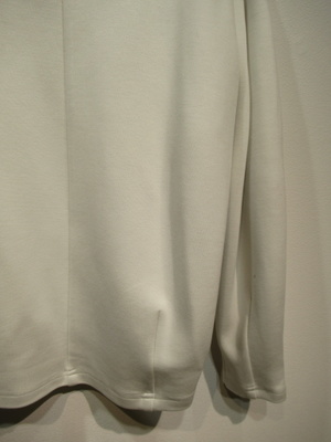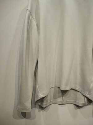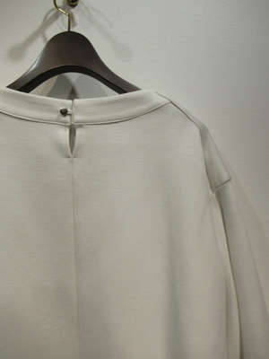 定番のアクリルレーヨンのカットソー ドロップショルダーで袖山タック入り 裾は前後差が有り フロントアーチ型 後ろの裾にタックが入りややコクーンシルエット ネック後ろゴールドのボタン 手洗い可能