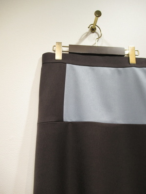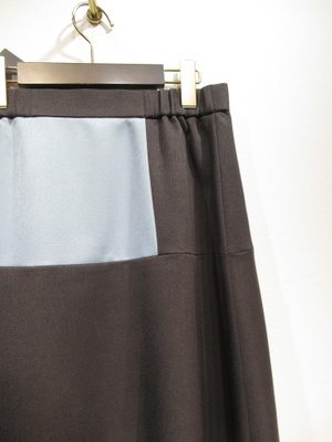 Aラインスカート 裏地あり 横ファスナー ウエスト脇の方にゴム入り 3段切り替え パッチワーク(サックスブルーとダークブラウンの2色配色使い)