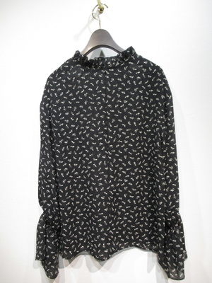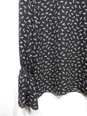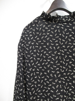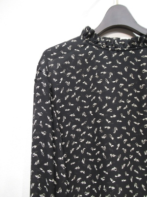 袖ドロップ、袖口ベルスリーブ(途中ゴム入り)襟ぐりがフリル、後ろファスナー、靴のプリント、手洗い可能