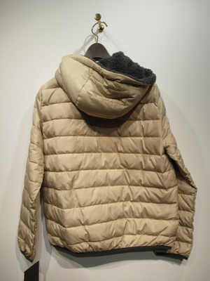 薄手のダウンジャケットコート、フード襟取り外し可能、フードの内側グレーのボア