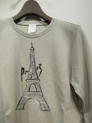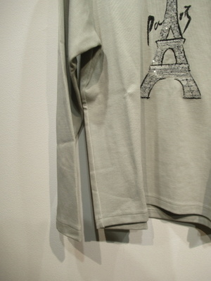 クルーネック 長袖 細かいテレコ素材 フロントスパンコールでエッフェル塔をモチーフにしたデザイン画 オフホワイトがゴールド グレージュはシルバー 手洗い可能