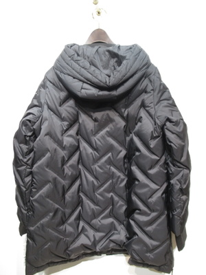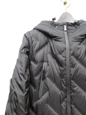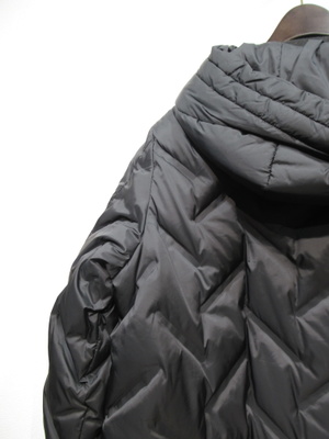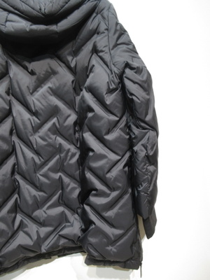 ヒップが隠れるミディアム丈のコート、フード襟(紐調整可)、正面ファスナー、両脇にファスナーでスリット入りにもできます