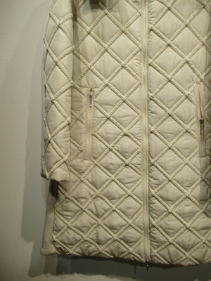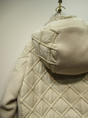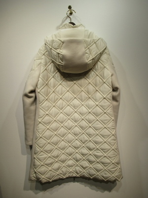 ひざ丈のロングコート、格子デザイン、フード取り外し可能、袖の内側と脇が異素材(同色)