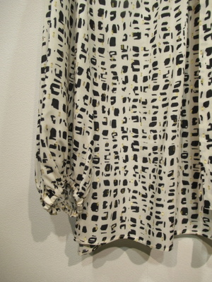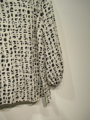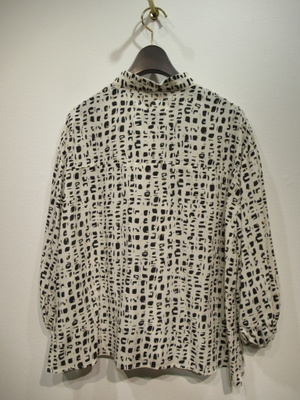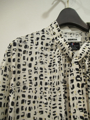 ※春物新作 小紋柄(金糸をところどころ使用)ドロップショルダー 8分袖 袖口ギャザーゴム フロントギャザー 細めのリボンタイ フロント10cmほど開き(2個ボタン)手洗い可能