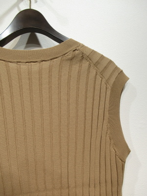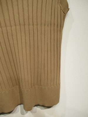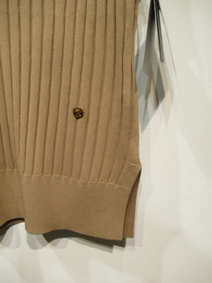 太リブのややフレンチスリーブ、ニットベスト、両脇10pほどスリット入り、袖口・襟ぐり・裾リブ、左下にゴールドのワンポイントパーツあり、手洗い可能