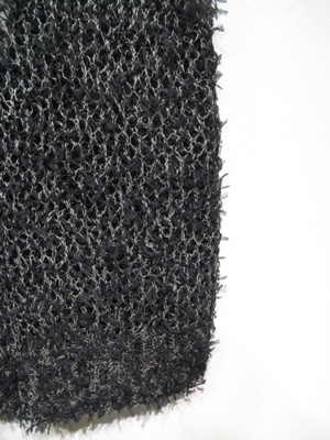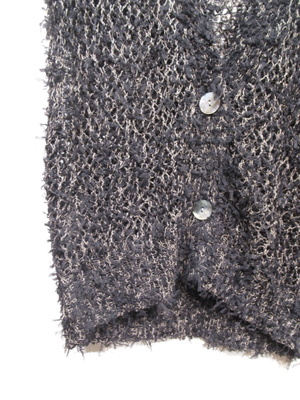 ざっくり目の透かし網、全体的にリボンヤーンも加えてあります、前開きのベスト、深く開いたVネック(大きめボタン2つ)、手洗い可能