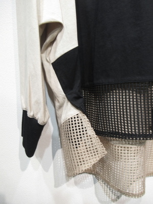 黒とベージュの配色 袖口リブ 裾は前後差が有り 後ろ長め 裾周りメッシュの異素材使い 脇スリット 手洗い可能