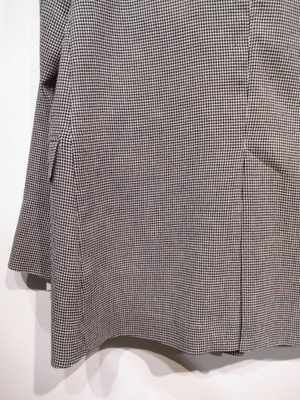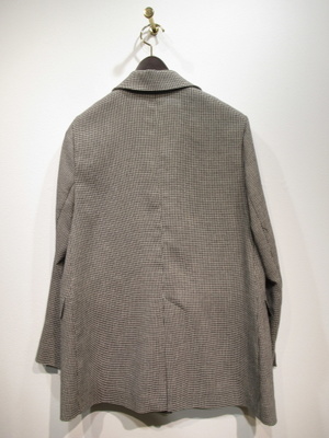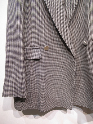 細かいチェック柄の生地、裏地なしのダブルジャケット、テーラード襟、後ろスリット(中心)、袖口はスリット入りで折り返しできます