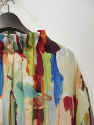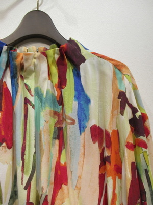 カラフルなプリント柄のブラウス、ドロップショルダー、身幅はやや広め、襟ぐりややボトルネック、(首周りにタックが入っていて、裏にやや太めのゴム入り)、袖口ギャザー、カフスあり、手洗い可能