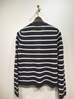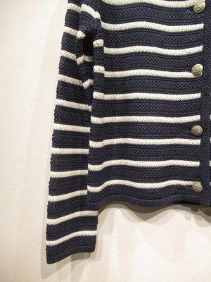 ボーダー柄のニットジャケット、フロントシルバーのボタン、手洗い可能