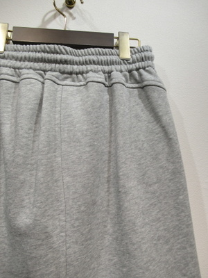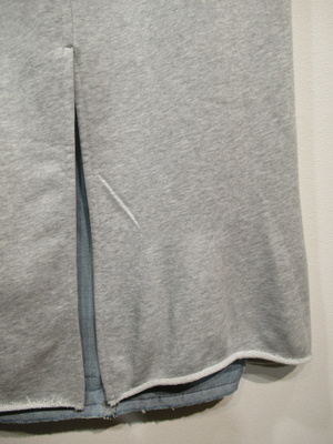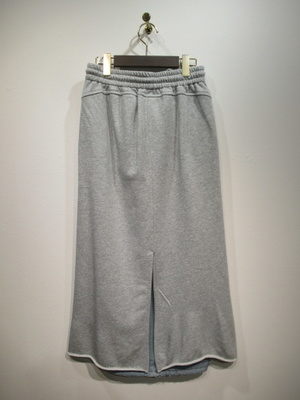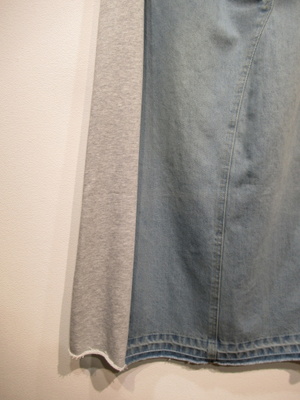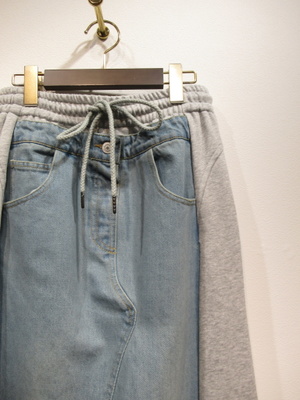デニム地とスエット生地をドッキングしたセミタイトのカジュアルスカートウエストはギャザーゴムと紐調整 フロントポケット 後ろスリット入 裏地無し 裾は切りっぱなし 手洗い可能
