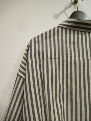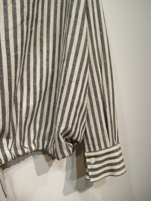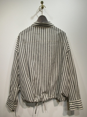オフホワイトとミディアムグレーはミディアムグレーのストライプ柄、ドロップショルダー、ざっくりめシャツ、裾はドロスト、袖口カフス、羽織にもなります、手洗い可能