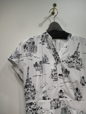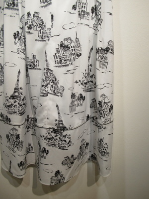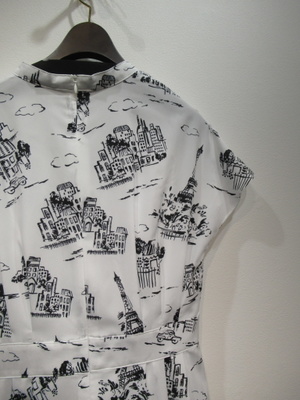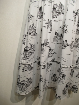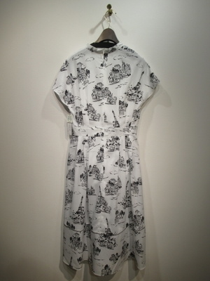 白地に黒のプリント柄、フレンチスリーブ、フロントスキッパー襟でウェスト近くまで開きます(シルバーの縁取りに黒のボタン)、後ろファスナー、ウェスト切り替え、スカート部分はタックプリーツ入り、ペチコート付き、手洗い可能、脇ポケットあり