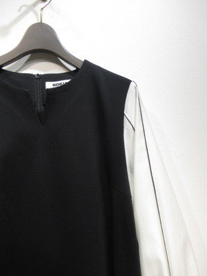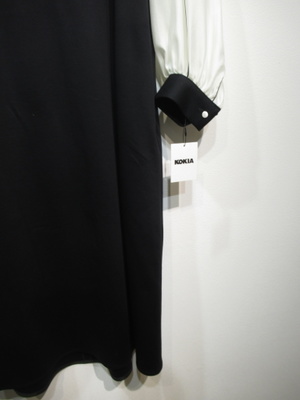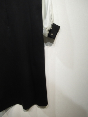 サックワンピース、身頃は綿のカットソー地、袖の白い部分は異素材のポリエステル、袖山に2本黒のピンタック入り、袖口も綿の黒のカフス、後ろファスナー、脇ポケットあり、裏地なし、手洗い可能