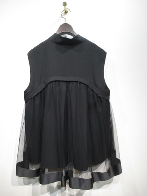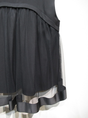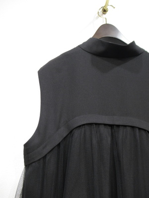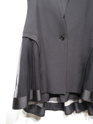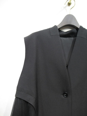 V開き一つボタンのベスト 裏地付き 後ろの中心から脇にかけてチュールレースの異素材をドッキング 後ろ下がりのデザイン