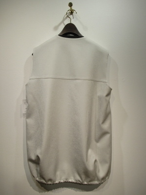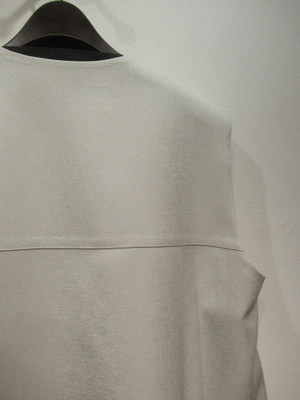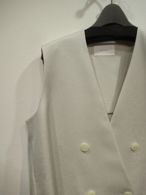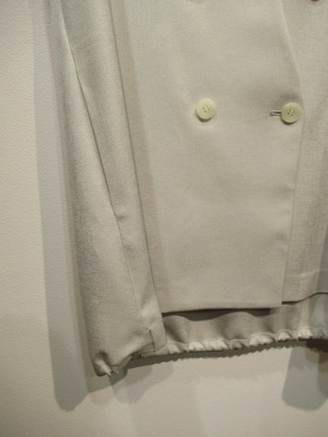 光沢感のあるポリエステル生地、裏地無しのダブルのジレ、後ろ裾がドロスト入り、シルエットがコクーンになります、手洗い可能