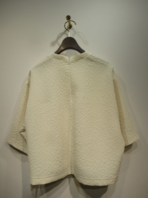 凹凸のある生地(やや光沢あり)、ドロップショルダー、六分袖、袖筒広め、後ろファスナー、手洗い可能
