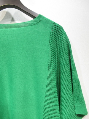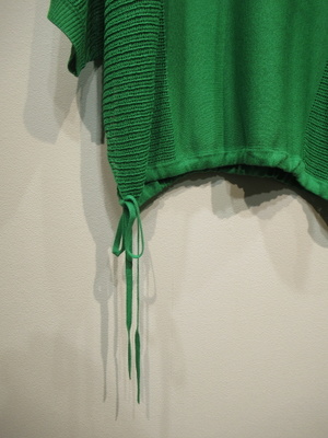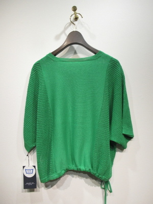 六分袖、袖筒広め、袖から脇にかけては畦編み・身頃はメリヤス編み、裾絞り(ドロスト)右側、手洗い可能
