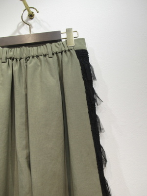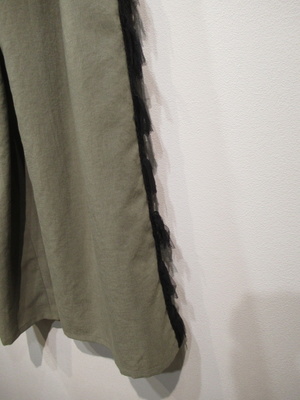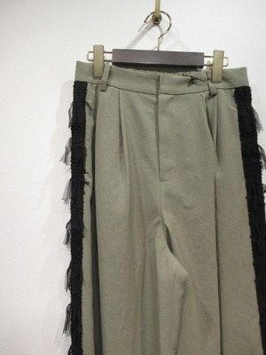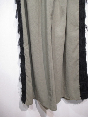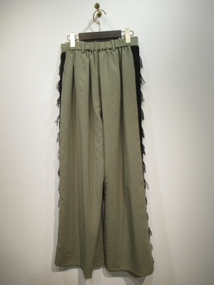 脇ラインに黒のチュールレースのフリンジをあしらってる、幅広ワイドパンツ、フロントファスナー、ウェスト後ろゴム入り、裏地なし、脇ポケット、フロント2タック、手洗い可能