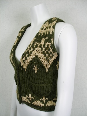 モスグリーンにゴールドの模様。ハンドメイドのコンパクトなニットベスト。裏地なし。