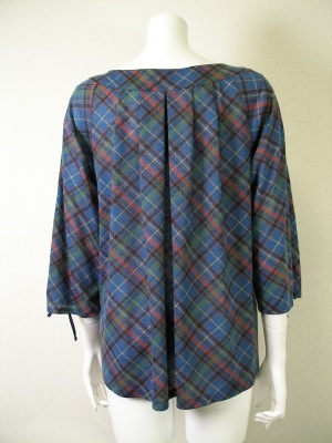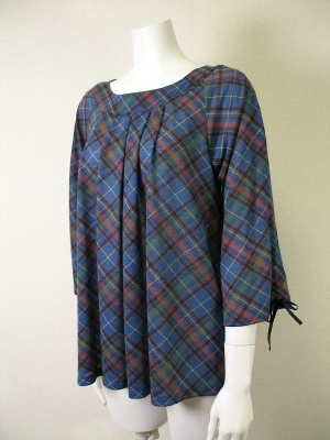 ポリエステル90%、毛10%の薄手でトロンとした素材。袖口のリボンを絞ってギャザーをよせるデザイン。