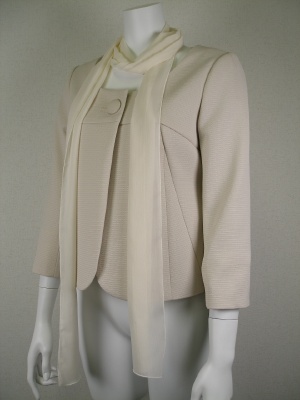 ストール付き、一つボタンのボレロ風 スカートとワンピースが同生地で揃います。さらに色違い有、サイズも38、40が揃いますので卒業入学にお使いいただけます