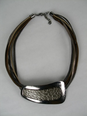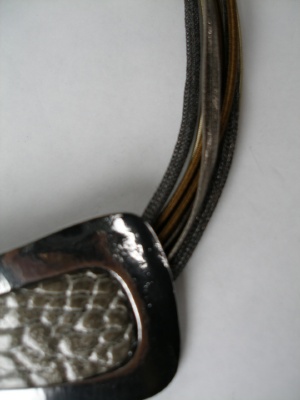 大きな型押しのパーツがインパクト。ヒモ部分は合皮、ゴムなどの素材で8本重なっています。
