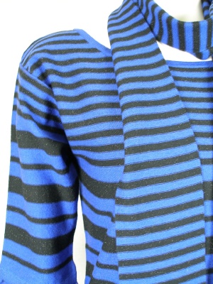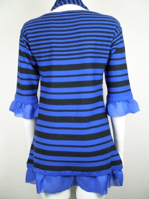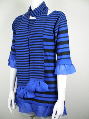 鮮やか青色のニットチュニック、ボウタイ付きです 裾のフリル・・別布(シルク100%)を使用