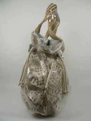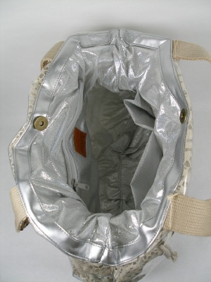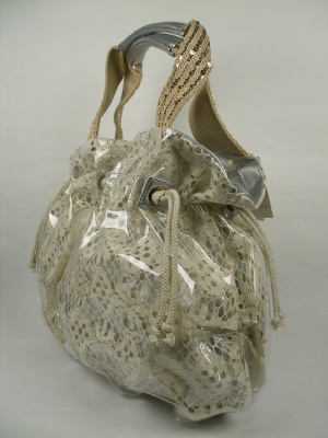 綿レース地にビニールでコーティング。内側はシルバーの生地を使用 ウチにポケット有・・持ち手(2本手)