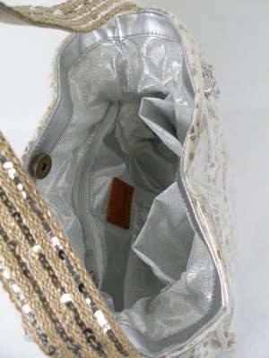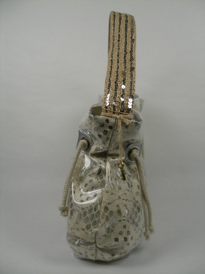 綿レース地にビニールでコーティング。内側はシルバーの生地を使用 ウチにポケット有・・持ち手(1本手)