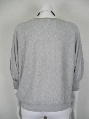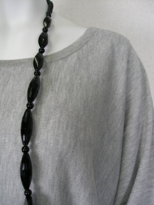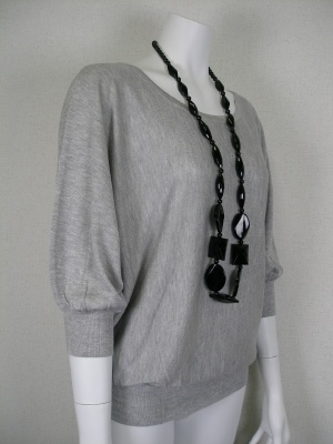 ドルマンスリーブのニットとロングネックレスのセット。これだけで、今年らしい組み合わせ。裾のリブが腰にフィットします。