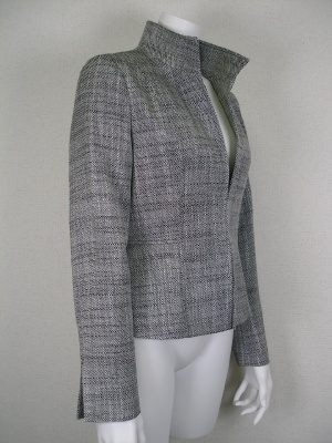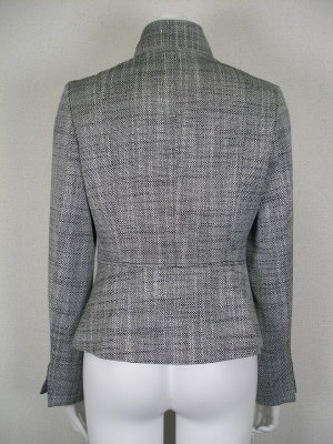 スッキリとした細身のジャケット。フロントはホック留め、袖口にスリット、よく見ると全体にシルバーの細かいラメ入り。スーツになるスカートもございます。裏地はポリエステル。