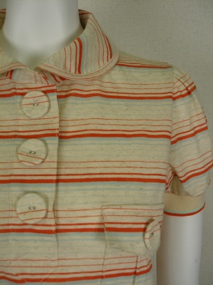 丸衿とくるみボタンで、レトロな可愛さがあります。着丈はやや短めで、薄い素材ですがほとんど透けません。