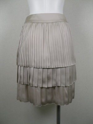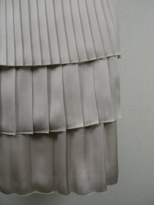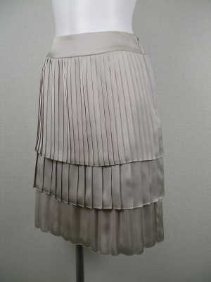 サテン生地のプリーツスカート。3段フリル部分はそれぞれプリーツの太さが異なるので、ボリュームが出すぎずほど良い甘さ加減です。