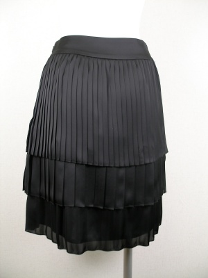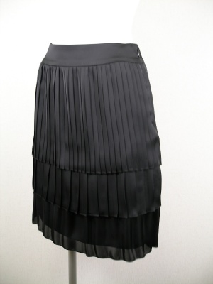 サテン生地のプリーツスカート。3段フリル部分はそれぞれプリーツの太さが異なるので、ボリュームが出すぎずほど良い甘さ加減です。