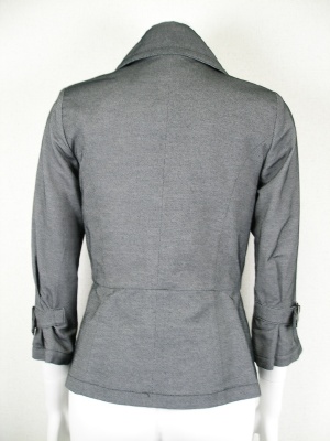 デニム風素材のダブルジャケット(トレンチ型)台衿の高さとボリュームのある衿が特徴