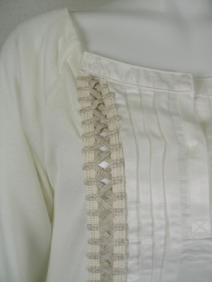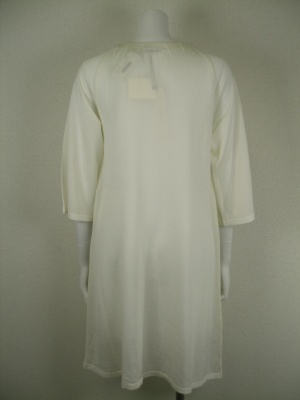 別布(フロントの光沢素材部分)キュプラ45%、綿41%、麻14%。ややワイドなお袖は八分袖位なので、インナーには長袖がよく合います。