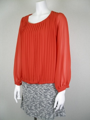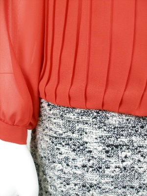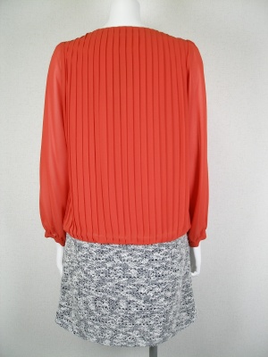 シフォンとツイードの異素材ワンピース。身頃には裏地が付いていて透けませんが、お袖は程よくシースルーです。シフォン・裏地はポリエステル100%。