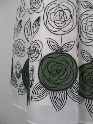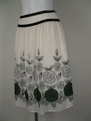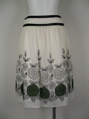 薄く軽い生地にバラの刺繍がフェミニンです。ウエストの黒いラインはサテン生地。綿の裏地付きで夏も着心地が良く、透けません。