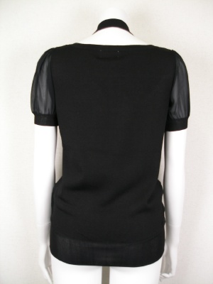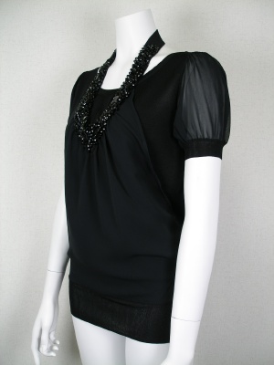 袖がシフォンのニットに、シフォンのホルターネックを重ね着したようなデザイン。大小のビーズを付けたネックラインもポイントです。シフォンはポリエステル100%。
