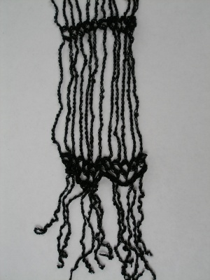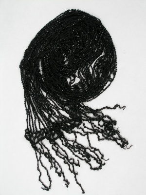 ビーズたっぷりのストール。細くストンと落ちるので、大人っぽく使えます。素材はポリエステルで、ビーズがアクリル。